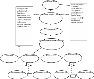В недавнее время этот процесс стал объектом для изучения многими учеными школами на Западе. Именно в этом явлении, считали, кроется секрет успеха маркетинга любого товара или услуги. За это время было проведено десятки научных исследований, направленных на изучение формирования удовлетворения, его структуры, влияющих факторов и т.д., а также роль удовлетворения в поведении потребителя, а именно его реакции на покупку.. Процесс потребления и услуг, и товаров содержит одни и те же элементы. Начиная с осознания потребности, выбора провайдера услуги (товара), принятия решения о покупке, удовлетворения и заканчивая реакцией на покупку. В целом, анализируя ряд научных работ и синтезируя их в нечто единое, можно представить схему поведения потребителя в процессе потребления следующим образом.( см. Рисунок 1) Основным мотивом покупки является получение удовольствия (положительных эмоций и новых впечатлений) от потребления. Удовольствие формируется при условии удовлетворения потребностей.