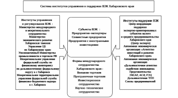 В первой главе была представлена структура внешнеэкономического комплекса экономического субъекта страны, которая включает ядро – основные структурные элементы и обеспечивающие факторы, описана система органов и организаций, призванных управлять и содействовать развитию ВЭК. Опираясь на нее, проанализируем структуру управления и поддержки ВЭК Хабаровского края, и дадим характеристику его основным элементам.