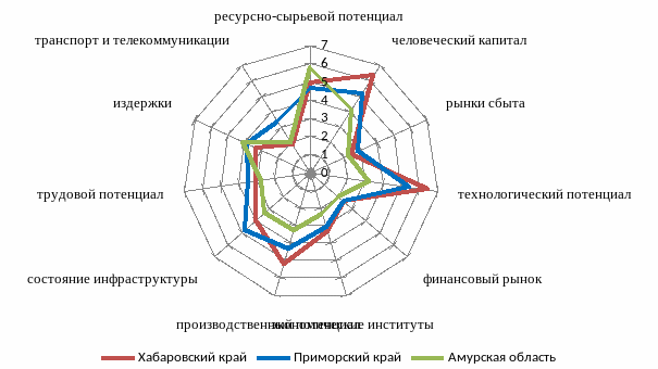 В качестве конкурентной среды Хабаровского рассматривались такие экономические территории ДФО как Приморский край и Амурская область, имеющие примерно равные условия для ВЭД. На рисунке 7 графически приведены результаты анализа конкурентных позиций Хабаровского края по сравнению с ее основным конкурентами-регионами ДФО.