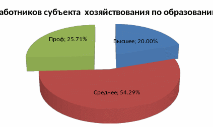 По уровню образования на ИП работники подразделяются следующим образом, 20% сотрудников имеют высшее образование. Это показатель, создает позитивную картину образовательного уровня кадров. 56% работников имеют среднее техническое образования, 26% работников не имеют образование или профессиональное училище. Все сотрудники, имеющие среднее специальное образование представляют собой неспециализированный персонал (рисунок 9).
