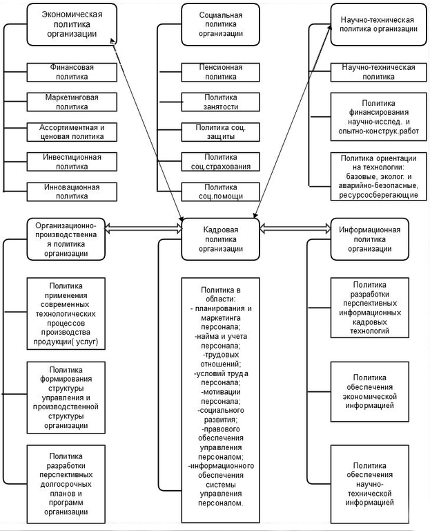 Таким образом, кадровая политика рассматривается как один из составляющих элементов управления персоналом. Именно кадровая политика определяет стратегии как долгосрочные, так и краткосрочные и цели развития организации. Она тесно увязана с другими видами политики организации (экономической, социальной, организационной, научно-технической и т.д.), дополняет и интегрирует в общую политику всей организации.