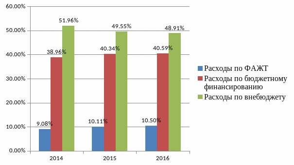 Из данного рисунка видно, что основная статья расходов по ФАЖТ-стипендии. Также расходы по стипендии в 2016г. увеличились на 0,08% по сравнению с 2014г.