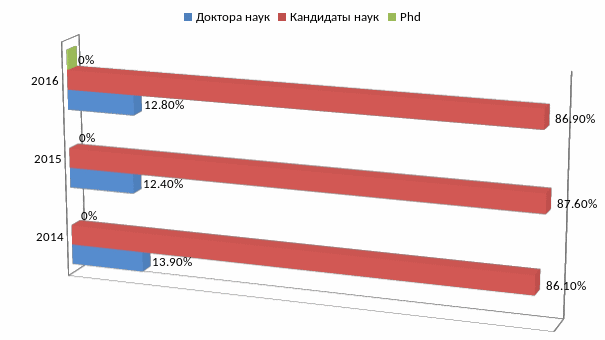 В структуре основного ППС (2014/2016)по ученым степеням и званиям отмечается снижение по всем показателям. Докторов наук стало меньше на 9,8%; Кандидатов наук -0,95%; Профессоров -14,3%.; Доцентов -5,4%. Стоит отметить появление преподавателя с ученой степенью Phd.Тем не менее, несмотря на снижение показателей к базисному периоду, по сравнению с 2015г. произошел рост всех показателей, что говорит о положительной динамике.