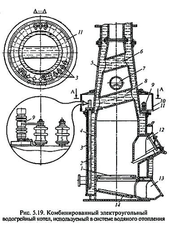 Для увеличения поверхности нагреваемой воды в коническую часть топки установлены циркуляционные трубы 6, 7, и 8. В нижней части топки расположены колосниковая решетка 1 и наклонный лист зольника 14. Уголь загружается в котел через топочное отверстие 12, через него же извлекается шлак. Зола и мелкий шлак удаляются через отверстие зольника 13. На опорном фланце в зоне топки размещены три изолятора 9, через которыевысоковольтные провода подводятся к нагревательным элементам котла./23/