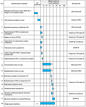 На основе данных расчетов, составляется технологический график обработки транзитных поездов в приемоотправочном парке «М», который представлен на рисунке 4.1.