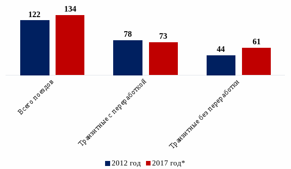 Рост транзитного вагонопотока без переработки зафиксирован в четном направлении, при этом несмотря на общее снижение числа поездов с транзитными вагонами с переработкой (за счет увеличения условной длины нечетных порожних поездов, следующих в переработку со станций Находка-Восточная, Посьет и т.д.).