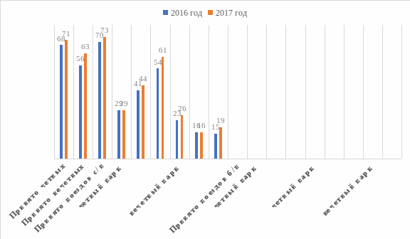 Прием поездов по направлениям за период с 2016 по 2017 год, с разбивкой по паркам станции приведен на рисунке 2.4.