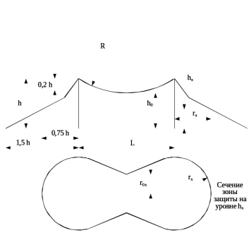 Рисунок Г.1 – Зона защиты двух стержневых молниеотводов