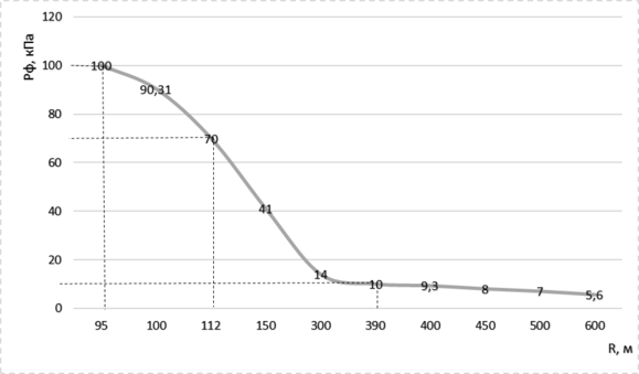 Рисунок 7.1. Зависимость избыточного давления на фронте ударной волны ∆Рф от расстояния R до эпицентра взрыва