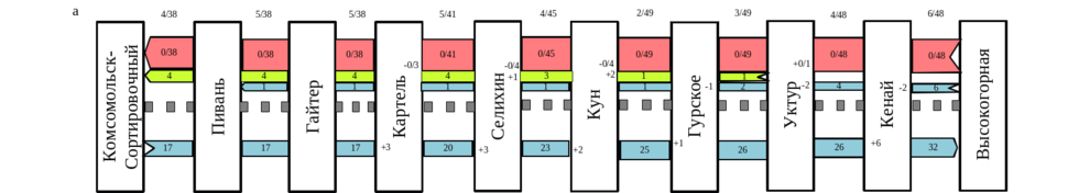 Размеры движения поездов при существующих вагонопотоках принимаем на направлении: Комсомольск-Сортировочный – Ванино 19 четных поездов и 19 нечетных поездов, Ванино – Советская Гавань Город 1 четный и 1 нечетный поезд.