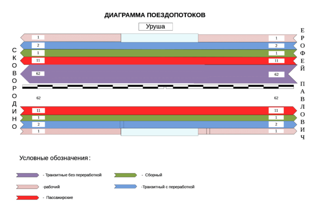 Таким образом, станция Уруша в четном направлении пропускает 62 грузовых транзитных поезда без переработки, два поезда с работой по станции назначением на станцию Сковородино (расстановка вагонов по географии), один сборный поезд с прицепкой или отцепкой местных вагонов, четыре пассажирских поезда, четыре почтово-багажных и два пригородных поезда, один рабочий графиковый поезд и один хозяйственный не графиковый поезд.