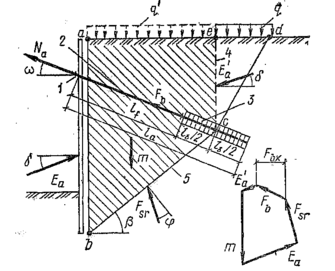Построенный из условия равновесия заштрихованной призмы силовой многоугольник abce включает в себя вес грунта G, равнодействующую активного давления Eа на анкеруемое сооружение, силу реакции Rs, несущую способность анкера Ра и равнодействующую активного давления грунта E′а на фиктивную анкерную стенку. Решение силового многоугольника позволяет определить горизонтальную проекцию Рах несущей способности анкера, которая приводит заштрихованную призму в состояние предельной устойчивости.