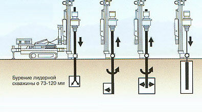 Устройство свай из грунтобетона выполняется в два этапа: производство прямого (бурение скважины) и обратного хода буровой колонны. В процессе обратного хода производят подъем колонны с одновременным ее вращением. При этом поднимают давление цементного раствора, который поступает в сопла монитора, создающие струю с высокой кинетической энергией. Сваи, образуемые с использованием струйной технологии, могут быть круглого сечения, а также секущиеся. Технология струйной цементации может быть эффективно применена при решении следующих задач подземного строительства: