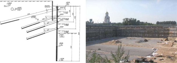 Рис. 3.4 Схема анкерного крепления (а) и котлован (б) московского Океанариума на Поклонной горе.