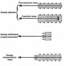 Для крепления ограждений котлованов в городских условиях в большинстве случаев используются буровые анкеры. Конструкция бурового инъекционного грунтового анкера изображена на рис.3.3а и состоит из оголовка, тяги в оболочке и рабочей части, защемленной в грунте. Тяга передает выдергивающее усилие от оголовка, закрепленного на внутренней стороне ограждения котлована, на рабочую часть (корень) анкера, препятствующую выдергиванию. По способу сопротивления выдергиванию их конструкции классифицируются на анкеры трения, анкеры лобового сопротивления и анкеры смешанного типа (рис.3.3б). По конструкции анкерной тяги различают стержневые, прядевые и трубчатые анкеры. Как правило, анкеры подвергаются предварительному натяжению, что позволяет снизить горизонтальные перемещения ограждения котлована и изгибающие моменты в нем.