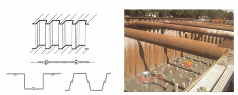 Шпунтовые ограждения котлованов широко используются в гидротехническом строительстве в условиях слабых водонасыщенных грунтов при высоких отметках уровня подземных вод. Такие конструкции способны воспринимать не только давление грунта, но и гидростатическое давление, являясь одновременно противофильтрационной завесой. Шпунтовые элементы стен представляют собой стальные профили U, Z образного поперечного сечения или плоские (рис. 3.8), снабженные замковыми захватами по краям, позволяющими фиксировать один элемент относительно другого в вертикальном положении. Наибольшее распространение получили U-образные шпунты типа «Ларсен». Установка шпунта в грунт осуществляется обычно вибропогружением. Шпунтовые стены, устроенные в замок, обладают достаточно высокой жесткостью и способны воспринимать изгибающие моменты, значительно превышающие предельные значения для ограждений с забиркой (рис. 3.8). Ограничением для использования шпунта является сложность или невозможность его погружения в гравелистых, скальных и полускальных грунтах. В настоящее время данный вид ограждения глубоких котлованов получил широкое распространение и в условиях плотной городской застройки.