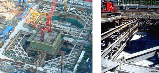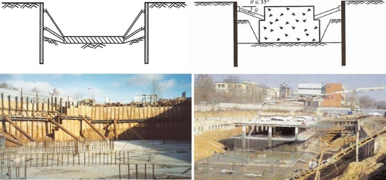 При больших в плане размерах подземного сооружения возможно использовать так называемый «островной» метод строительства (рис.3.15а) или распорок, упираемых в перекрытия каркаса центральной части сооружения (рис. 3.15б).