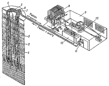 Искусственное замораживание грунтов-наиболее универсальный и надежный способ временного улучшения физико- механических свойств слабых водонасыщенных грунтов. Оно применяется в любых водонасыщенных грунтах начиная от глинистых и кончая скальными трещиноватыми и кавернозными. Ограничивающим условием является скорость потока грунтовых вод (не более 200м/сут).Сущность данного способа заключается в том, что через систему замораживающих скважин, расположенных по периметру и в теле будущей выработки, пропускается хладоноситель с низкой температурой, который, отнимая от окружающего грунта тепло, превращает его в ледопородный массив, обладающий полной водонепроницаемостью и высокой прочностью. Этот массив способен воспринимать большое боковое давление слабых грунтов и гидростатический напор грунтовых вод.