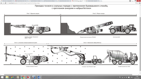 Тоннель - горизонтальное или наклонное искусственное подземное сооружение, предназначенное для транспорта, пропуска воды, размещения коммуникаций или производственных предприятий. Проходка тоннелей относится к одному из самых сложных видов строительных работ. Проходку тоннеля ведут ограниченными по длине одинаковыми участками - заходками. Длина участка - глубина заходки - зависит от инженерно-геологических условий заложения тоннеля, размеров его поперечного сечения, главным из которых является ширина, способа проходки, материала обделки. После разработки грунта специализированной техникой производится набрызгбетонирование. В комплекс работ по возведению набрызгбетонного покрытия (крепи) входит: подготовка поверхности выработки, установка и монтаж элементов крепи (анкеры, арки, металлическая сетка), послойное нанесение покрытия, уход за свеженанесенным покрытием, контроль качества. На рис. 3.16 показаны этапы устройства временной крепи тоннелей.