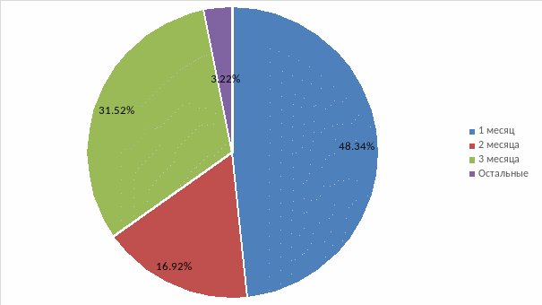 Как показывает практика управление адаптацией – не однодневное мероприятие, а многоступенчатый процесс, занимающий длительное время. Опыт российских компаний показывает, что период управления адаптации для сотрудников в зависимости от их должности может составлять от месяца до полугода. В некоторых компаниях адаптационный период приравнивается к испытательному сроку, то есть трем месяцам, разрешенным Трудовым кодексом Российской Федерации. На рисунке 1 представлена длительность испытательных сроков которые устанавливают российские компании.