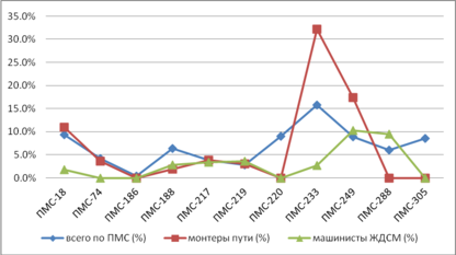 Максимальный живут процент текучести вопросам кадров допущен точки в ПМС-233 и составил 15,8 %, работы в ДРП (собств.) – 12,5 %. Минимальный определения процент текучести деятельности кадров допущен различие в ПМС-186 и составил 0,4 %, руководство ПМС-219 – 2,8 % варианты (рисунок 4)