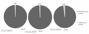 В составе внеоборотных активов в 2014 г. произошло снижение результатов исследований и разработок на 37%, к 2015 г. этот показатель еще уменьшился на 30%. Основные средства к 2014 г. увеличились на 2%, но к 2015 г. значение показателя увеличилось на 11%. Прочие внеоборотные к 2014 г. увеличились на 48%, но к 2015 г. значение показателя уменьшилось на 29%.