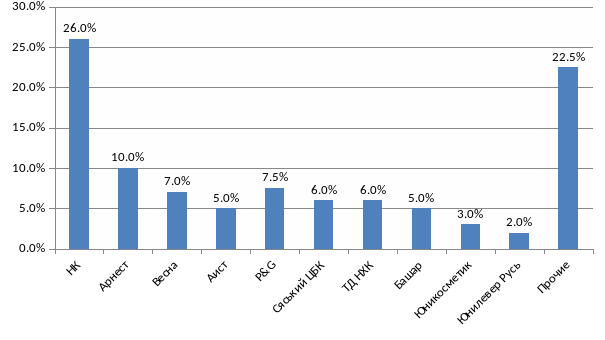 Рисунок 9 показывает, что 26% своего бюджета компания тратит на закупки товаров «Невской косметики», 10% - на товары «Арнеста», примерно по 7% - на продукцию P&G и «Весны», 6 % - на продукцию ТД НХК. На оставшихся поставщиков, которых порядка 38, компания тратит 22,5% своего бюджета. Полный перечень поставщиков является конфиденциальной информацией и не разглашается посторонним лицам.