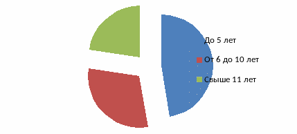 | До 5 лет 90 человек | От 6 до 10 лет 57 человек | Свыше 11 лет 43 человека | |||