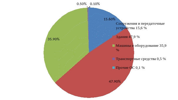 На рисунке 4 изображено процентное отношение видов основных средств к первоначальной стоимости основных производственных фондов в 2013 году, согласно данным Приложения к бухгалтерскому балансу – Ф №5.