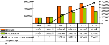 На рисунке 6 за период 2009-2014 годов показано количество начисленной, использованной на обновление ОПФ и неиспользованной амортизации по филиалу «ЛуТЭК».