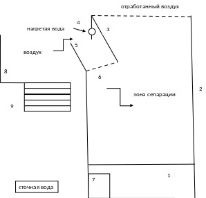 1 - поддон; 2 - корпус; 3- наклонная перегородка; 4 водораспределительная система с форсунками типа ЦС; 5 - воздуходувное окно; 6- устройство принудительного вторичного дробления крупных капель(может отсутствовать); 7- фильтр 8- смотровая площадка с ограждением; 9 - лестница