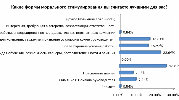 Данные, представленные на рисунке 2.6 иллюстрируют высокую материальную заинтересованность сотрудников(49%), однако, не стоит упускать из вида, что для 15% респондентов важен дружный коллектив, 8% заостряют внимание на условиях труда, для 12% сотрудников важно признание своих трудовых заслуг.