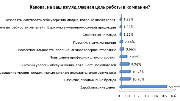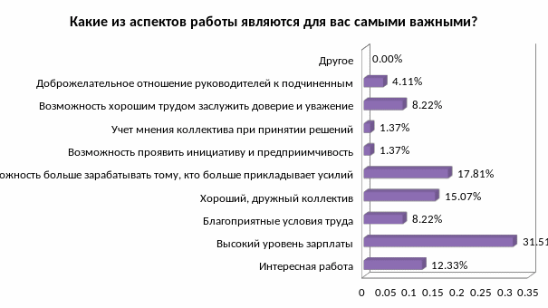 Как видно из представленных рисунков, 51% сотрудников считает, что главной целью работы является процесс заработка денежных средств, при чем 58% рабочих довольны уровнем своей заработной платы. Это говорит о хорошо разработанной и эффективной системе материального стимулирования.