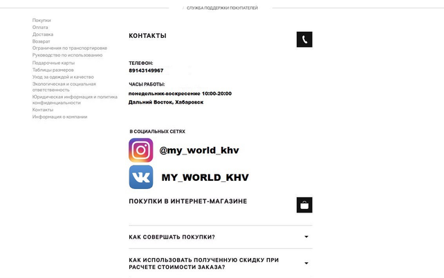 Сейчас в магазине "My World" налажены основные способы обратной связи с покупателем. Прежде всего таким способом является телефонная линия по работе с клиентами 8-(914)-314-99-67.