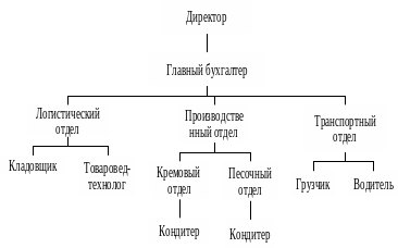 Рассмотрим организационную структуру кондитерского цеха, которая имеет линейно-функциональный вид. Под организационной структурой предприятия понимается состав, взаимодействие и распределение работ по подразделениям и органам управления, между которыми устанавливаются определенные отношения. Общая схема организационной структуры представлена на рисунке 2.1.