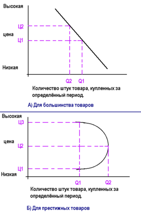 Кривая показывает, какое количество товара будет продано на рынке в течение конкретного отрезка времени по разным ценам, которые могут взиматься в рамках данного отрезка времени. В обычной ситуации спрос и цена находятся в обратно пропорциональной зависимости, т. е. чем выше цена, тем ниже спрос. И собственно, чем ниже цена, тем выше спрос. Так что, подняв цену с Ц1 до Ц2, фирма продаст меньшее количество товара. Вероятно, потребители с ограниченным бюджетом, столкнувшись с выбором альтернативных товаров, станут покупать меньше тех, цены которых оказываются для них слишком высокими. Большинство кривых спроса стремится вниз по прямой или изогнутой линии, как показано на рисунке 6(А). Однако в случаях с престижными товарами кривая спроса иногда имеет положительный наклон типа представленного на рисунке 6(Б).