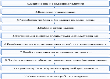 Ядром всей системы управления человеческими ресурсами является кадровая политика организации, которая включает совокупность принципов, основных моделей, целей и представлений, определяющих направление и содержание работы с кадрами на длительную перспективу. Задачи управления человеческими ресурсами - это определенные виды работы, которые должны быть выполнены для достижения главной цели.