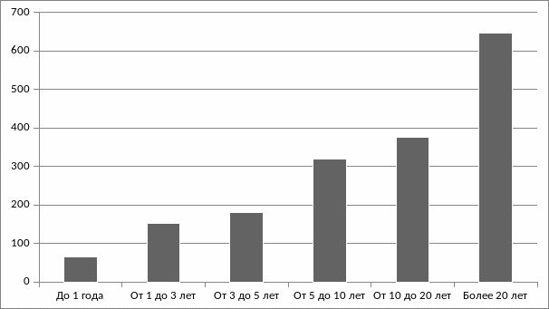 На Рисунке 9 можно рассмотреть распределение персонала по стажу работы.