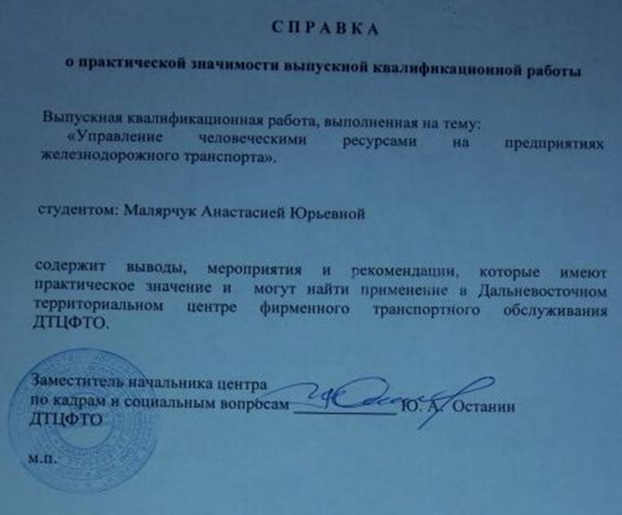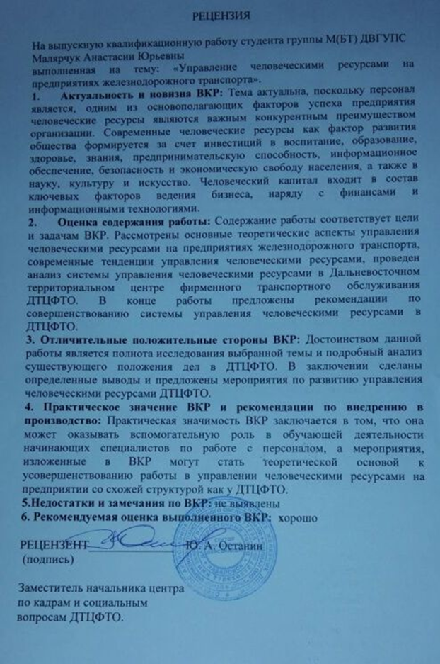 Во второй главе проведен анализ системы управления человеческими ресурсами в Дальневосточном территориальном центре фирменного транспортного обслуживания ДТЦФТО.