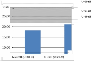 В условиях пропуска тяжеловесных поездов по участку Уссурийск – Надеждинская с межпоездным интервалом 11 минут при использовании системы ЭУП наименьшее среднее напряжение на токоприемниках поездов при проследовании ими лимитирующего блок-участку составляет Uмин=21,29 кВ.