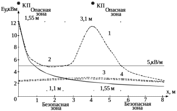 Проведен анализ - напряженности электрического поля контактной сети переменного тока над головой человека, при различных вариантах подвеска КП, на однопутном и двухпутном участках пути. Как видно из полученных зависимостей опасное влияние напряжённости наблюдается непосредственно в близи источника электрического поля (зависимости:1 - двухпутный участок h=6,8 м; 2 - Однопутный участок h=6,8), расстояние вредного влияния 1,55 метров от оси подвеса КП. Для остальных зависимостей (3-4), которые получены не вблизи КП, напряжённость ЭП - в приделах нормы. Предельно допустимое время пребывания в зонах, напряжённость которых превышает или рана 5 кВ/м, не должна превышать рабочего дня. Эти мероприятия уменьшают вредный фактор при проведений работ на контактной сети. Это значительно улучшит здоровье работников выполняющих обслуживание контактной сети и воздушных линий.