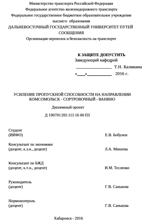 Главной задачей в дипломном проекте является расчет пропускной способности Северного широтного хода на направлении Комсомольск-Сортировочный – Советская Гавань с учетом роста объема перевозок, разработка реконструктивных мероприятий на станциях и участках для формирования и пропуска планируемого количества поездов.