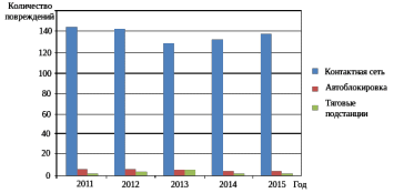 Распределение повреждений устройств контактной сети по элементам в 2011-2015 году приведено в таблице 1.2.