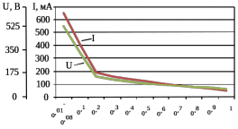 | I, мА | 650 | 400 | 190 | 160 | 140 | 125 | 105 | 90 | 75 | 65 | 50 |