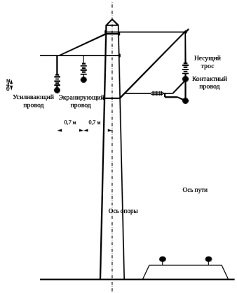 Как видно из рисунка 4.1, усиливающий и экранирующий провода подвешиваются с полевой стороны опоры. Они предназначены для уменьшения потерь электроэнергии, снижения опасных индуктивных влияний на смежные сооружения, уменьшения потенциала рельса и сопротивления тяговой сети примерно в два раза.