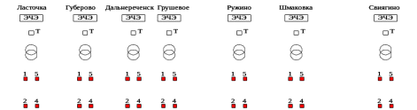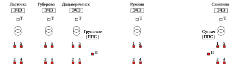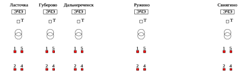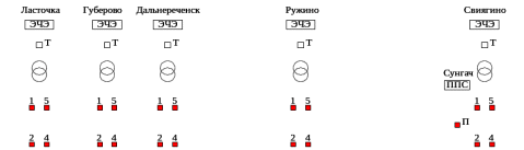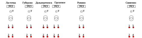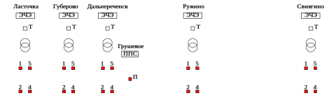 2.4) Межподстанционные зоны Дальнереченск – Ружино и Ружино – Свиягино по протяжённости больше допустимой длины 50 км. Так как самый низкий уровень напряжения был зафиксирован на участке Ружино – Свиягино, то, для начала, предлагается установить подпитывающую подстанцию на станции Грушевое с тяговым трансформатором ТДТНЖУ 25000/110 У1. Схема данного решения представлена на рисунке 4.14.