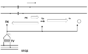 Здесь обозначения соответствуют : ПК и РК – аппаратура питающего и релейного концов рельсовой цепи соответственно; Пр. инф. – аппаратура сигнальной точки, осуществляющая преобразование соответствующей информации, полученной от РК или других объектов, что необходимо для функционирования сигнальной точки СЦБ; Св. – светофор сигнальной точки; TV – линейный трансформатор, преобразующий переменное напряжение ВЛ СЦБ в напряжение