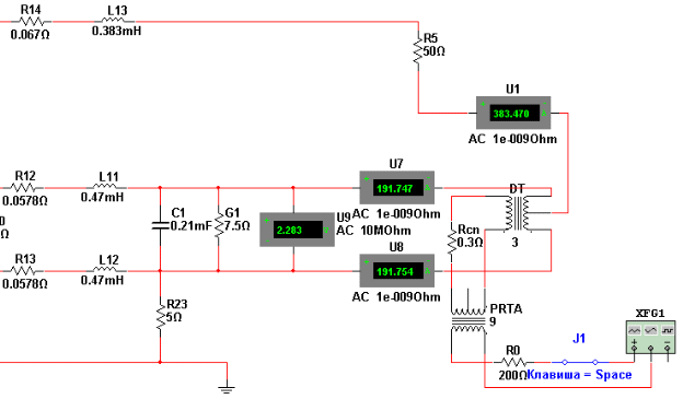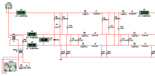 Создание имитационной модели во многом облегчает проверку теоретических идей. Явным преимуществом имитационной модели является реализация процессов протекающих во времени. В нашем случае, имитационная модель должна отображать токи и напряжения, которые отображают совместную работу системы тягового электроснабжения и СЦБ. Токи и напряжения должны быть соразмерны реальным величинам. Также она должна позволять вносить изменения в схему, которые в реальности осуществить не представляется возможным. Способ создания имитационной модели был заимствован из [9]. Построение имитационной модели происходит в среде Simulink, программного комплекса Multisim. Подробнее рассмотрим фрагмент схемы модели, представленный в [9], на рисунке 5.1.