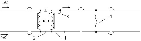 где n – количество проводов, шт; ro – радиус одного провода, м; rp – радиус окружности, по которой располагаются провода расщепленной фазы, м. В нашем случае n = 2, ro = rср = 0,0056 м (средний радиус контактного провода и несущего троса); rp = acp / 2 = 1,6 / 2 = 0,8 м (аср – среднее расстояние между контактным проводом и несущим тросом, м). После вычисления по формуле (6.1) получим rэ = 0,095 м. Для дальнейшего расчета воспользуемся расчетной схемой представленной на рисунке 6.5.