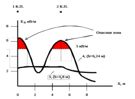 Допустимое значение напряженности электрического поля, в котором может находиться обслуживающий персонал может в течение восьмичасового рабочего дня, составляет 5 кВ/м. На рисунке 6.6 представлен график зависимости Еу от х, по данным таблицы 6.1.
